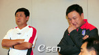 오는 10일 벌어질 남아공 월드컵 아시아 최종예선 북한과의 1차전을 앞두고 한국과 북한의 사령탑 허정무 김정훈 감독이 9일 홍커우 스타디움에서 공식 기자회견을 가졌다. 김정훈 감독과 허정무 감독이 기자회견 전 만나 잠시 얘기를 나눈 후 생각에 잠겨 있다./상하이=손용호 기자spjj@osen.co.kr [Copyright ⓒ 한국 최고의 스포츠...