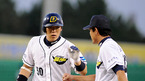 '2008 삼성 PAVV 프로야구' 두산 베어스와 KIA 타이거즈 경기가 13일 잠실구장에서 벌어졌다. 6회말 무사 2루 김현수 1타점 적시타를 치고 1루에서 김민호 코치의 환영을 받고 있다./잠실=김영민 기자ajyoung@osen.co.kr [Copyright ⓒ 한국 최고의 스포츠 엔터테인먼트 전문 미디어...