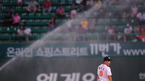 '2008 삼성 PAVV 프로야구' 선두를 독주하고 있는 SK 와이번스와 4위 삼성에 1.5게임을 뒤지고 있는 한화 이글스의 경기가 14일 민족 고유의 명절인 한가위에 인천 문학야구장에서 벌어졌다. 6회초 1사 2루 김태균 타석때 갑자기 외야의 스프링클러가 작동 경기가 중단되고 있다./문학=손용호 기자spjj@osen.co.kr...