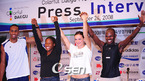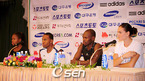 여자 장대높이뛰기 세계기록을 보유하고 있는 옐레나 이신바예바를 비롯한 32개국 136명의 선수들이 참가하는 '2008대구국제육상경기대회'를 하루 앞두고 24일 오후 대구 인터불고호텔에서 주요 선수들이 기자회견을 가졌다. 이신바예바, 월프레드 번게이, 리반 센즈, 로린 윌리엄스(오른쪽부터)가 합동 기자회견서 나란히 앉아 있다./대구=김영민...