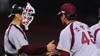 '2008 삼성 PAVV 프로야구' 두산 베어스와 히어로즈의 경기가 25일 잠실구장에서 벌어졌다. 이 날 경기에서 연장 10회서 나온 조중근의 1타점 결승 적시타에 힘입어 히어로즈가 5-2로 두산에게 승리를 거두었다. 경기를 마치고 히어로즈 조용훈 투수와 김동수 포수가 기쁨을 나누고 있다./잠실=민경훈 기자rumi@osen.co.kr...