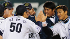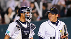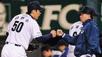 '2008 삼성 PAVV 프로야구' 두산 베어스와 삼성 라이온즈의 경기가 26일 잠실구장에서 벌어졌다. 이 날 경기에서 두산은 선발 이혜천의 5⅔이닝 무실점 호투와 3회 터진 김현수의 선제 결승타에 힘입어 1-0으로 승리를 거뒀다. 경기를 마치고 두산 김현수와 김경문 감독이 하이파이브를 하고 있다./잠실=민경훈...