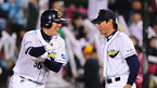 '2008 삼성 PAVV 프로야구' 두산 베어스와 삼성 라이온즈의 경기가 26일 잠실구장에서 벌어졌다. 3회말 2사 주자 2루 두산 김현수가 우중간 선취 1타점 적시타를 날린 후 1루에서 강인권 코치와 환하게 웃으며 얘기를 나누고 있다./잠실=민경훈 기자rumi@osen.co.kr [Copyright ⓒ 한국 최고의 스포츠...