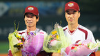 2008 삼성 PAVV 프로야구' 히어로즈와 두산 베어스의 경기가 2일 목동야구장에서 벌어졌다. 경기 전 프로통산 2번째 2000안타를 기록한 전준호와 프로통산 3번째 2000경기를 출장한 김동수에 대한 시상이 있었다. 전준호 김동수가 꽃다발을 들고 취재진에게 포즈를 취하고 있다./목동=손용호 기자spjj@osen.co.kr...