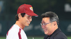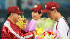 2008 삼성 PAVV 프로야구' 히어로즈와 두산 베어스의 경기가 2일 목동야구장에서 벌어졌다. 경기 전 프로통산 2번째 2000안타를 기록한 전준호와 프로통산 3번째 2000경기를 출장한 김동수에 대한 시상이 있었다. 이광환 히어로즈 감독이 김동수에게 꽃다발을 건네고 있다./목동=손용호 기자spjj@osen.co.kr [Copyright...