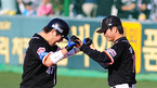 '2008 삼성 PAVV 프로야구 준플레이오프' 삼성 라이온즈와 롯데 자이언츠의 3차전이 11일 대구구장에서 벌어졌다. 4회초 2사 주자 1,3루 롯데 강민호가 우중간 1타점 적시타를 날리고 1루에서 공필성 코치와 하이파이브를 하고 있다./대구=민경훈 기자rumi@osen.co.kr [Copyright ⓒ 한국 최고의 스포츠...