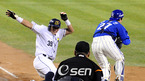 '2008 삼성 PAVV 프로야구' 플레이오프 두산 베어스와 삼성 라이온즈의 경기가 16일 잠실 야구장에서 벌어져 두산이 8-4로 승리 첫 승을 거두었다. 7회말 무사 만루 김동주의 짧은 우익수 희생플라이때 3루주자 이종욱이 홈을 파고들어 역전 득점을 올리고 있다./잠실=손용호 기자spjj@osen.co.kr [Copyright ⓒ...