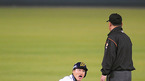 '2008 삼성 PAVV 프로야구' 두산베어스와 삼성 라이온즈 플레이오프 2차전 경기가 17일 잠실야구장에서 열렸다. 4회말 2사 1루 채상병 타석때 1루 주자 두산 홍성흔 2루 도루를 했으나 삼성 김재걸 2루수에게 태그아웃 처리되자 임채섭 2루심에게 아쉬운 표정을 지어보이고 있다./잠실=김영민 기자ajyoung@osen.co.kr...