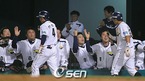 '2008 삼성 PAVV 프로야구' 두산베어스와 삼성 라이온즈 플레이오프 2차전 경기가 17일 잠실야구장에서 열렸다. 3회말 1사 2,3루 두산 오재원 우중간 2타점 3루타 때 홈을 밟은 전상렬과 이종욱이 덕아웃에서 동료선수들에게 환영 받고 있다./잠실=윤민호 기자 ymh@osen.co.kr [Copyright ⓒ 한국...