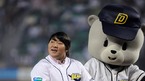 '2008 삼성 PAVV 프로야구' 두산베어스와 삼성 라이온즈 플레이오프 2차전 경기가 17일 잠실야구장에서 열렸다.경기에 앞서 시구자로 나선 베이징올림픽 역도 금메달리스트 장미란이 두산 베어스 마스코트에게 글러브를 받고 있다./잠실=윤민호 기자 ymh@osen.co.kr [Copyright ⓒ 한국 최고의 스포츠...