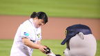 '2008 삼성 PAVV 프로야구' 플레이오프2차전 두산 베어스와 삼성 라이온즈의 경기가 17일 잠실 야구장에서 벌어졌다. 베이징 올림픽 역도 금메달 리스트 장미란이 두산 마스코트로 부터 글러브와 공을 전달받고 있다../잠실=손용호 기자spjj@osen.co.kr [Copyright ⓒ 한국 최고의 스포츠 엔터테인먼트 전문...