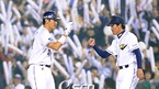'2008 삼성 PAVV 프로야구' 두산베어스와 삼성 라이온즈 플레이오프 2차전 경기가 17일 잠실야구장에서 열렸다. 7회말 2사 2루 두산 채상병이 좌중간 1타점 동점타를 날리고 김민호 코치와 기뻐하고 있다./잠실=윤민호 기자 ymh@osen.co.kr [Copyright ⓒ 한국 최고의 스포츠 엔터테인먼트 전문 미디어...