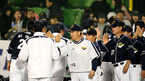 '2008 삼성 PAVV 프로야구' 두산베어스와 삼성 라이온즈 플레이오프 4차전 경기가 20일 대구야구장에서 열렸다. 두산이 선발타자 전원 안타와 21안타를 터뜨리며 12-6 대승을 거두었다. 경기 종료후 김경문 감독이 선수들을 격려하며 승리의 기쁨을 나누고 있다./대구=김영민 기자ajyoung@osen.co.kr...