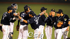 '2008 삼성 PAVV 프로야구' 두산베어스와 삼성 라이온즈 플레이오프 4차전 경기가 20일 대구야구장에서 열렸다. 두산이 선발타자 전원 안타와 21안타를 터뜨리며 12-6 대승을 거두었다. 경기 종료후 선수들이 승리의 기쁨을 나누고 있다./대구=김영민 기자ajyoung@osen.co.kr [Copyright ⓒ 한국 최고의...