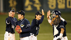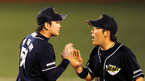 '2008 삼성 PAVV 프로야구' 플레이오프5차전 삼성 라이온즈와 두산 베어스의 경기가 21일 대구야구장에서 벌어져 두산이 김현수와 김동주의 홈런을 앞세워 6-4로 승리하며 한국시리즈 진출의 유리한 고지를 점령했다. 하이파이브를 하는 임태훈 앞을 김창희가 지나가고 있다./대구=손용호 기자spjj@osen.co.kr...
