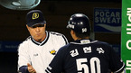 '2008 삼성 PAVV 프로야구' 두산베어스와 삼성 라이온즈 플레이오프 5차전 경기가 21일 대구야구장에서 열렸다. 3회말 2사 두산 김현수 우월 솔로 홈런을 날리고 홈인 김경문 감독의 축하를 받고 있다./대구=김영민 기자ajyoung@osen.co.kr [Copyright ⓒ 한국 최고의 스포츠 엔터테인먼트 전문 미디어...