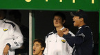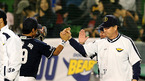 '2008 삼성 PAVV 프로야구' 두산베어스와 삼성 라이온즈 플레이오프 5차전 경기가 21일 대구야구장에서 열렸다. 두산이 김동주 투런홈런과 김현수의 솔로홈런 11안타에 힘입어 6-4 승리를 거두며 한국시리즈 진출 1승을 남겨 두었다. 경기 종료후 김경문 감독이 호수비를 펼친 이종욱과 하이파이브를 하고 있다./대구=김영민...