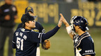 '2008 삼성 PAVV 프로야구' 두산베어스와 삼성 라이온즈 플레이오프 5차전 경기가 21일 대구야구장에서 열렸다. 두산이 김동주 투런홈런과 김현수의 솔로홈런 11안타에 힘입어 6-4 승리를 거두며 한국시리즈 진출 1승을 남겨 두었다. 경기 종료후 마무리 임태훈이 채상병 포수와 하이파이브를 하고 있다./대구=김영민...