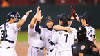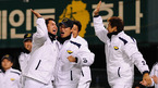 '2008 삼성 PAVV 프로야구' 플레이오프 6차전 두산 베어스와 삼성 라이온즈의 경기가 23일 잠실야구장에서 벌어졌다. 이 날 경기에서 두산은 5-2로 승리하며 시리즈 전적 4승 2패로 2년 연속 한국 시리즈 진출에 성공했다. 경기를 마치고 두산 선수들이 환호하며 경기장으로 뛰쳐나오고 있다./잠실=민경훈기자rumi@osen.co.kr...