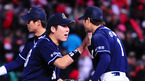 '2008 삼성 PAVV 프로야구' 한국시리즈1차전 SK 와이번스와 두산 베어스의 경기가 26일 인천 문학야구장에서 벌어져 두산이 아버지의 장례식 참가도 미룬 랜들의 역투와 최준석의 2타점 적시타를 앞세워 5-2로 서전을 승리로 장식했다. 세이브를 거둔 이재우가 채상병 포수와 하이파이브를 하고 있다./인천=손용호...