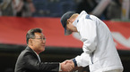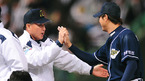 '2008 삼성 PAVV 프로야구' 한국시리즈1차전 SK 와이번스와 두산 베어스의 경기가 26일 인천 문학야구장에서 벌어져 두산이 아버지의 장례식 참가도 미룬 랜들의 역투와 최준석의 2타점 적시타를 앞세워 5-2로 서전을 승리로 장식했다. 김경문 감독이 이재우를 반갑게 맞이하고 있다./인천=손용호 기자spjj@osen.co.kr...