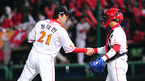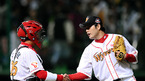 '2008 삼성 PAVV 프로야구' 한국시리즈2차전 SK 와이번스와 두산 베어스의 경기가 27일 인천 문학야구장에서 벌어져 김재현의 투런홈런을 앞세운 SK가 5-2로 승리를 거두었다. 세이브를 거둔 정대현이 박경완 포수와 악수를 나누고 있다./인천=손용호 기자spjj@osen.co.kr [Copyright ⓒ 한국 최고의 스포츠...