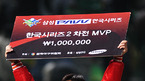 '2008 삼성 PAVV 프로야구' 한국시리즈 2차전 SK 와이번스와 두산 베어스 경기가 27일 인천 문학야구장에서 열렸다. SK 와이번스가 김재현의 투런 홈런포와 박재상의 결승타점에 힘입어 5-2 승리를 거두었다. 경기 종료후 한국시리즈2차전 MVP SK 김재현이 시상식을 마친후 팬들에게 인사를 하고 있다./인천=김영민...