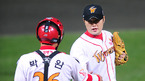 '2008 삼성 PAVV 프로야구' 한국시리즈 2차전 SK 와이번스와 두산 베어스의 경기가 27일 인천 문학구장에서 벌어졌다. 이 날 SK는 장단 9개의 안타를 집중시킨 끝에 5-2로 승리했다. 경기를 마치고 SK 마무리 정대현투수와 박경완 포수가 악수를 하고 있다./문학=민경훈기자rumi@osen.co.kr [Copyright...