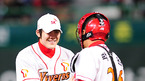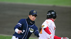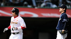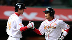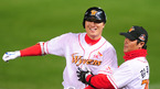 '2008 삼성 PAVV 프로야구' 한국시리즈 2차전 SK 와이번스와 두산 베어스 경기가 27일 인천 문학야구장에서 열렸다. 1회말 2사 1,3루 이진영 중전 선취 1타점 안타를 날리고 김태균 1루코치의 환영을 받고 있다./문학=민경훈기자rumi@osen.co.kr [Copyright ⓒ 한국 최고의 스포츠 엔터테인먼트 전문 미디어...