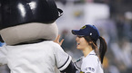 '2008 삼성 PAVV 프로야구' 한국시리즈5차전 두산 베어스와 SK 와이번스의 경기가 31일 잠실야구장에서 벌어졌다. 경기 전 배우 홍수아가 승리기원 시구를 하기 위해 마운드로 오르며 두산 마스코트와 장난을 치고 있다./잠실=민경훈 기자rumi@osen.co.kr [Copyright ⓒ 한국 최고의 스포츠 엔터테인먼트 전문...