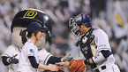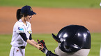 '2008 삼성 PAVV 프로야구' 한국시리즈 5차전 SK 와이번스와 두산 베어스 경기가 31일 잠실야구장에서 열렸다. 경기에 앞서 시구자로 나선 탤런트 홍수아가 시구를 마친후 두산 최승환 포수로 부터 시구볼을 건네받고 있다./잠실=김영민 기자ajyoung@osen.co.kr [Copyright ⓒ 한국 최고의 스포츠 엔터테인먼트...