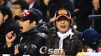 '2008 삼성 PAVV 프로야구' 한국시리즈5차전 두산 베어스와 SK 와이번스의 경기가 31일 잠실야구장에서 벌어졌다. 한국시리즈를 관전온 오지호가 시구를 한 홍수아와 얘기를 나누는 사이 송종호가 두산 선발 김선우가 아웃 카운트를 잡자 좋아하고 있다./잠실=손용호 기자spjj@osen.co.kr [Copyright ⓒ 한국...