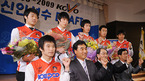 남자배구 드래프트가 3일 오후 서울시 강남구 청담동 리베라 호텔에서 열렸다. 삼성화재 신치용 감독이 구단 3라운드 2순위로 박수민을 지명한 뒤 포토타임을 갖고 있다./민경훈 기자rumi@osen.co.kr [Copyright ⓒ 한국 최고의 스포츠 엔터테인먼트 전문 미디어 OSEN(www.osen.co.kr) 무단전재 및 재배포 금지]