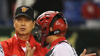 '2008 아시아시리즈' 한국 대표 SK 와이번스와 일본 대표 세이부 라이온즈의 경기가 13일 일본 도쿄돔 구장에서 벌어졌다. 이 날 경기에서 SK는 이재원의 결승투런포와 철벽 불펜진의 이어던지기가 빛을 발해 4-3의 짜릿한 역전승을 거뒀다. 경기를 마치고 SK 김성근 감독이 박경완에게 어깨를 두드리며 격려를 해주고 있다....