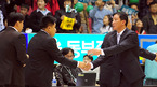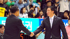 '2008-2009 동부 프로미 프로농구' 공동 1위를 달리고 있는 원주 동부와 전주 KCC가 15일 원주 치악체육관에서 1위 자리를 놓고 열띤 경기를 벌여 동부가 79-56의 손쉬운 승리를 거두며 단독 1위로 올랐다. 경기가 끝나고 KCC 허재 감독이 동부 전창진 감독과 악수를 나누고 있다./원주=손용호 기자spjj@osen.co.kr...