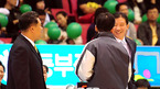 '2008-2009 동부 프로미 프로농구' 공동 1위를 달리고 있는 원주 동부와 전주 KCC가 15일 원주 치악체육관에서 선두 자리를 놓고 열띤 경기를 벌였다. 경기 전 심판이 양팀 감독을 불러 얘기를 나누는 가운데 허재 KCC 감독이 용산고 2년 선배인 전창진 동부 감독을 보며 웃고 있다./원주=손용호 기자spjj@osen.co.kr...