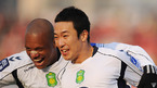 '삼성 하우젠 K-리그 2008' 성남 일화와 전북 현대의 6강 플레이오프 경기가 23일 탄천 종합운동장에서 벌어졌다. 이 날 경기에서 전북은 연장에 터진 루이스의 결승골에 힘입어 2-1로 역전승을 거두었다. 경기를 마치고 루이스가 두 손을 번쩍들고 있는 반면 성남 선수들은 주저앉고 있다./성남=민경훈 기자 rumi@osen.co.kr...