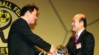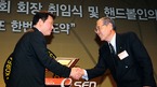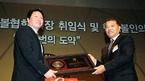 최태원 핸드볼 협회장 취임식이 2일 오후 서울 워커힐 호텔에서 열렸다. 이날 취임식은 연말을 맞이하여 핸드볼인들이 한해의 성과를 돌아보고 향후 핸드볼 발전을 위한 노력을 다짐하는 '핸드볼인의 밤' 행사를 겸해 열렸다. 야마시타 이즈미 일본핸드볼협회 임원이 최태원 핸드볼협회장에게 감사패를 전달하고 있다./윤민호...