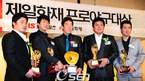 전통을 자랑하는 '2008 제일화재 프로야구대상 시상식'이 로이스터 감독을 제외한 7개구단 감독과 수상자들 각 구단 관계자들이 참석한 가운데 8일 오전 프라자 호텔에서 벌어졌다. 대상을 수상한 두산 김현수와 최고투수상을 수상한 SK 김광현 최고타자상을 수상한 김태균이 밝은 표정으로 포토타임을 갖고 있다./손용호...