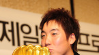 전통을 자랑하는 '2008 제일화재 프로야구대상 시상식'이 로이스터 감독을 제외한 7개구단 감독과 수상자들 각 구단 관계자들이 참석한 가운데 8일 오전 프라자 호텔에서 벌어졌다. 대상을 수상한 두산 김현수가 트로피에 키스를 하고 있다./손용호 기자spjj@osen.co.kr [관련기사]