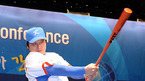 2009 WBC(WORLD BASEBALL CLASSIC) 국가대표 출정식 및 유니폼 발표회가 8일 서울 장충동 신라 호텔에서 열렸다. 김태균이 대표팀 유니폼을 입고 단상 위에서 배트를 휘두르고 있다./민경훈 기자 rumi@osen.co.kr