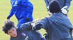 허정무 감독이 이끄는 대표팀이 11일 제주 서귀포시 토평동 서귀포 시민구장에서 오는 2월 11일 이란과의 2010 남아공 월드컵 아시아지역 최종 예선 4차전에 대비한 첫 훈련을 시작했다. 이청용과 김영광이 훈련 중 볼다툼을 하고 있다./서귀포=민경훈 기자 rumi@osen.co.kr