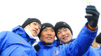 오는 2월 11일 이란과 2010 남아공 월드컵 아시아지역 최종 예선 4차전에 대비해 서귀포서 훈련 중인 국가대표 축구팀이 12일 오전 성산 일출봉에 올라 각오를 다지는 시간을 가졌다. 정상에서 정성훈이 이청용 기성용과 함께 셀카를 찍고 있다./서귀포=민경훈 기자 rumi@osen.co.kr