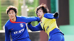허정무 감독이 이끄는 대표팀이 13일 제주 서귀포시 토평동 서귀포 시민구장에서 오는 2월 11일 이란과의 2010 남아공 월드컵 아시아지역 최종 예선 4차전에 대비한 훈련을 가졌다. 오전 훈련 연습경기에서 이청용과 김치우가 치열하게 볼다툼을 하고 있다./서귀포=민경훈 기자 rumi@osen.co.kr