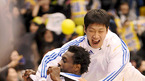 '2008-2009 동부 프로미 프로농구' 서울 삼성과 서울 SK 경기가 15일 잠실실내체육관에서 벌어졌다. 4쿼터 SK 섀넌이 종료 2.4초를 남겨놓고 75-74로 뒤집는 슛을 성공시킨 뒤 문경은과 환호하고 있다./잠실실내체=김영민 기자ajyoung@osen.co.kr
