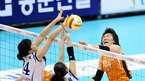 'NH농협2008~2009 V-리그' KT&G와 도로공사 경기가 24일 서울 올림픽 제2체육관에서 열렸다. KT&G 지정희가 도로공사 임효숙의 블로킹에 앞서 공격을 펼치고 있다./올림픽제2체=김영민 기자 ajyoung@osen.co.kr