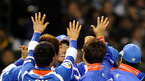 제2회 월드베이스볼클래식(WBC) 1라운드 A조 1,2위 순위결정전 한국-일본 경기가 9일 도쿄돔 구장에서 열려 한국이 선발 봉중근의 5⅓이닝 호투와 중간계투진의 완벽한 투구, 김태균의 적시타로 1-0으로 승리 일본에 콜드게임 패배의 빚을 갚았다. 김태균이 동료선수들과 승리의 하이파이브를 나누고 있다./도쿄돔=김영민...