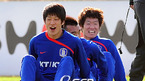 오는 4월 1일 서울월드컵구장에서 열리는 북한과의 2010 남아공월드컵 아시아 최종예선 5차전을 앞두고 태극전사들이 26일 파주 NFC에 소집됐다. 대표팀은 이에 앞서 28일 수원 월드컵구장에서 이라크와 평가전을 치른다. 오후 훈련에서 이청용 조원희 박지성이 한 조가 되어 뒤에 있는 선수의 발목을 잡고 앞으로 가는 훈련을 하며 웃고 있다./파주=손용호...