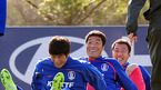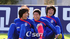 오는 4월 1일 서울월드컵구장에서 열리는 북한과의 2010 남아공월드컵 아시아 최종예선 5차전을 앞두고 태극전사들이 26일 파주 NFC에 소집됐다. 대표팀은 이에 앞서 28일 수원 월드컵구장에서 이라크와 평가전을 치른다. 오후 훈련에서 박주영 이근호 김창수가 한 조가 되어 뒤에 있는 선수의 발목을 잡고 앞으로 가는 훈련을 하며 웃고 있다./파주=손용호...