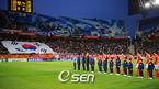 허정무 감독이 이끄는 한국 대표팀이 2010남아공월드컵 최종예선 5차전 북한과의 경기에 앞서 28일 오후 7시 수원월드컵경기장에서 이라크와 친선경기를 가졌다. 경기 전 애국가가 흐르며 대형 태극기가 펄럭이고 있다./수원=민경훈 기자 rumi@osen.co.kr